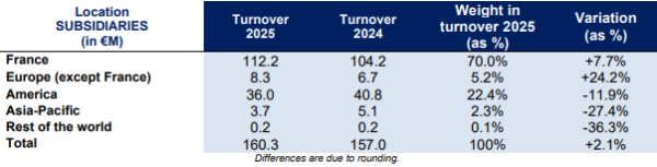 The Group reports turnover of €160.3M as of 31 December 2025, an increase of +2.1% (+3.0% at constant exchange rate). For the eighteenth consecutive quarter since Q2 2021, Q4 2025 turnover is increasing, reaching €42.9 million (+4.0% and +6.4% at constant exchange rate and perimeter).