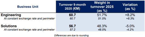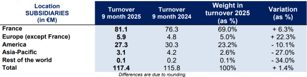As of September 30, 2025, the Group posted turnover of €117.4 million, up slightly by +1.4% and +1.8% at constant exchange rate. In the third quarter, turnover rose slightly to €36.9 million (+0.4% and +2.2% at constant perimeter and exchange rates).