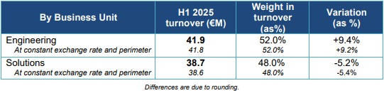 Solutions BU declines by 5.2% (-5.4% at constant exchange rates) with an unfavorable base effect in H1 (growth of +17.4% in H1 2024) and represents 48.0% of Group turnover.