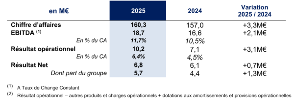 Le Conseil d’Administration réuni le 10 mars 2026 a arrêté les comptes de l’exercice clos le 31 décembre 2025. Les procédures d’audit sur les comptes annuels ont été effectuées. L’ensemble des soldes intermédiaires de gestion s’améliorent, avec un EBITDA à 11,7% du CA qui augmente à 18,7M€, un résultat opérationnel à 6,4% du CA en nette amélioration à 10,2M€ et un résultat net à 4,3% du chiffre d’affaires en croissance à 6,8M€.